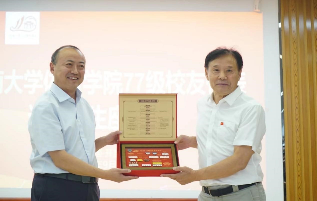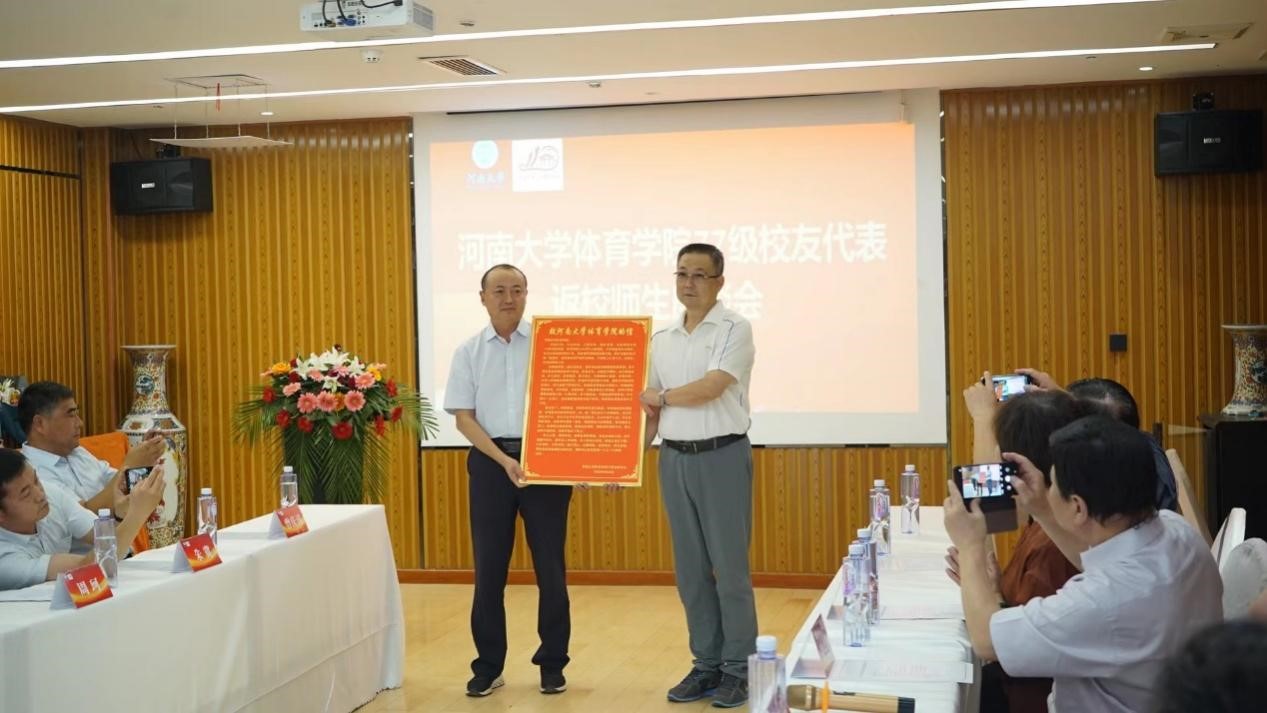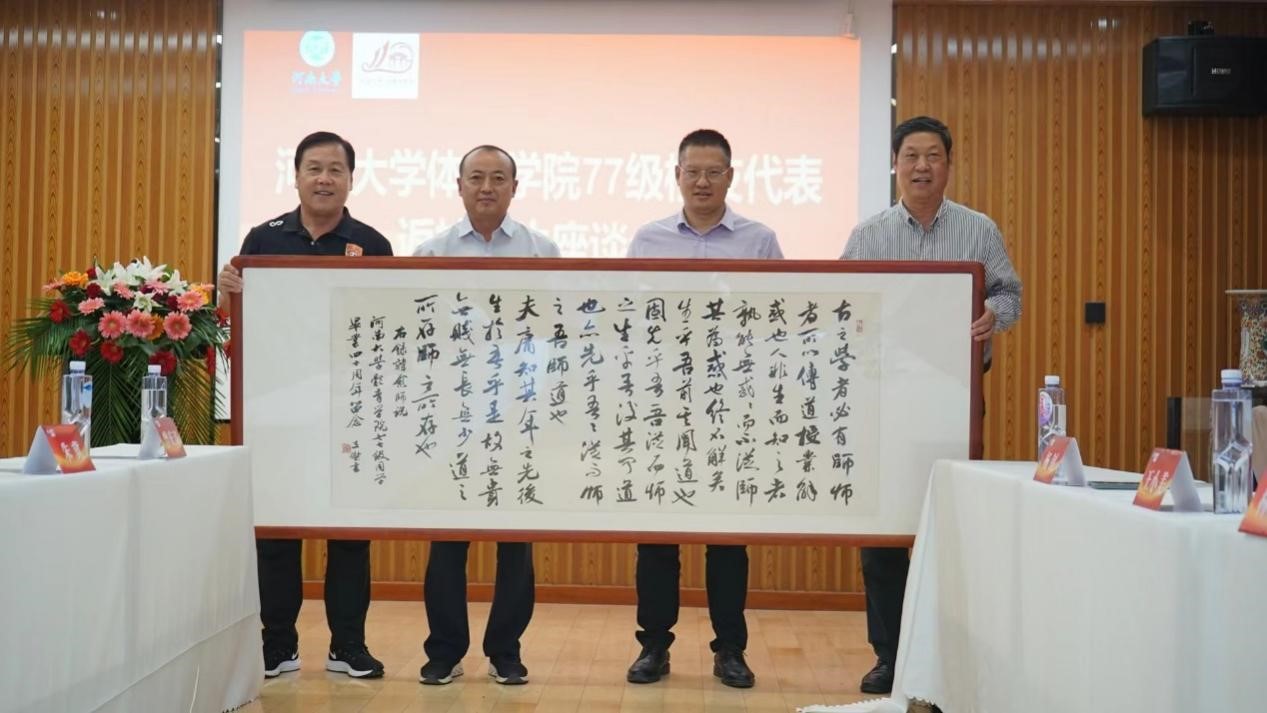 校友河南省体育局原副局长张跃敏、开封市教育体育局原副局长杨钊代表77级校友向体育学院赠送书法作品《师说》,感念师生情。校友郑州大学体育学院(校本部)原院长林克明、河南财经政法大学体育学院原院长崔伟和信阳师范学院体育学院原院长王小美向老教师们献上鲜花并赠送印有专门LOGO的纪念衫、纪念背包。段廷良代表体育学院向77级校友代表赠送米兰体育平台_米兰体育(中国110周年校庆专属纪念品徽章。