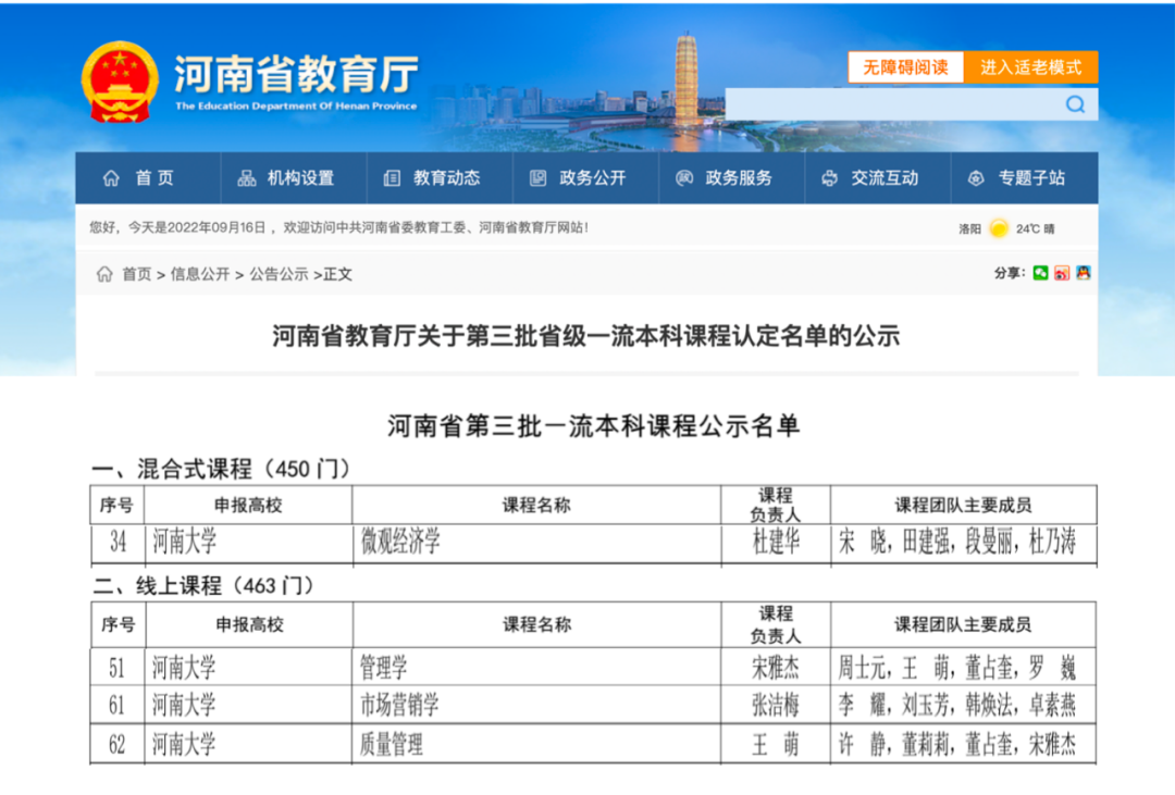 9月14日,河南省教育厅发布了关于第三批省级一流本科课程认定名单的公示。米兰体育平台_米兰体育(中国商学院共有4门课程获得认定,其中,混合式课程1门:《微观经济学》,线上课程3门:《管理学》、《市场营销学》、《质量管理》。这是继《财务管理》(2020年度)获批国家一流课程、《会计学》、《人力资源管理》、《跨境电商1210模式虚拟仿真实验》(2021年度)获批省级一流课程认定之后,学院在一流课程“双万计划”建设方面取得的又一项优异成绩。