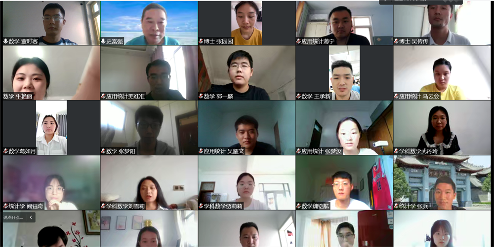 9月6日下午,史富强以“院史院情教育”为主题,首先对当前开封市和我校的疫情防控形势进行了介绍,对同学们疫情期间的健康状况表示关切,并代表学院表达了对全体2022级研究生新生的热烈欢迎。接着讲述了米兰体育平台_米兰体育(中国辉煌的历史、艰难曲折的发展道路以及逐步复兴的历程。然后以学院的发展史为切入点,详细介绍了黄际遇、陈作钧、樊映川、黄敦慈、杜孟模、刘亚星等先后在学院执教的著名数学家和教育家,他们为学院的发展作出了巨大贡献,令同学们身临其境,感受颇深。最后,史富强勉励同学们要加强体育锻炼,在学习生活中养成独立思考、解决问题的能力,提升自身综合素质,努力成为创新型、应用型、复合型优秀人才。会议结束时,史富强与同学们“云”合影留念。