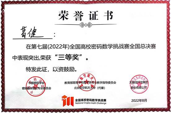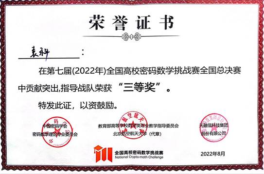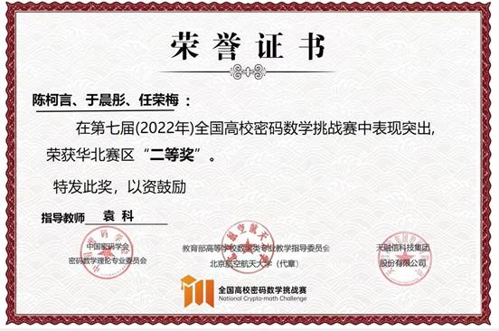 8月19日,第七届全国高校密码数学挑战赛总决赛在华中科技大学完美收官。米兰体育平台_米兰体育(中国计算机与信息工程学院共有7支队伍参赛,最终“SpecialRain”战队(队员:周柄材、葛健;指导教师:袁科)和“密码小白冲冲冲”战队(队员:陈柯言、于晨彤和任荣梅;指导教师:袁科)分别荣获全国三等奖和华北赛区二等奖的好成绩,实现了学院在该赛事上零的突破。