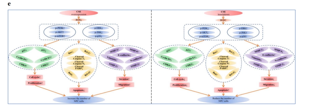 鼻咽癌是一种具有独特地理分布的恶性肿瘤。课题组研究发现,与人正常鼻咽上皮细胞相比,人鼻咽癌细胞中的CSE(一种内源性硫化氢生成酶)表达水平升高,CSE过表达促进鼻咽癌细胞增殖、迁移和侵袭,而抑制CSE表达具有相反作用。进一步研究揭示,CSE能够通过ROS介导的MAPK和PI3K/AKT/mTOR信号通路促进鼻咽癌细胞生长,CSE可能是鼻咽癌诊断和预后的一种新的肿瘤标志物。
